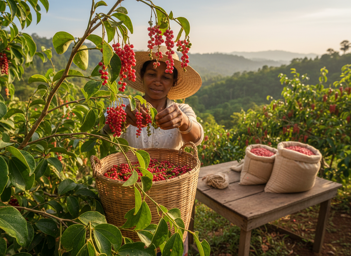 Featured in Wild Elixir, Madagascan pink pepper is prized for its refined brightness and soft, sparkling spice. Grown in small quantities and harvested by hand, the berries require careful drying before steam distillation can begin. The result is an oil that feels vibrant yet elegant — adding lift and modernity without harshness. Its rarity and labor-intensive production make it a favourite among luxury perfumers seeking nuance rather than sharp heat.